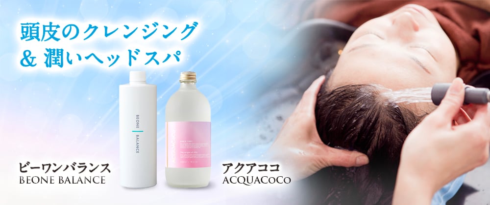 ビーワンバランス(500ml)、またはヘッドスパ用天然水アクアココ(520ml)です。