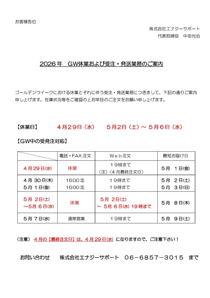 2026年4月15日 / 最終更新日 : 2026年4月15日 enespadmin 2026年GWの出荷業務及び休業のご案内 2026年度 ゴールデンウイークの休業とそれに伴う受注・発送業務につきまして、ご案内申し上げます。 在庫状況等をご確認の上、お早目のご注文をお願い申し上げます。 FacebooktwitterHatenaPocketCopy