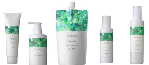 新しいヘアケアシリーズ「miduha(ミヅハ)」には、ビーワンの原水をもとに高品質な原料で作られたシャンプー、トリートメントetc をラインアップ